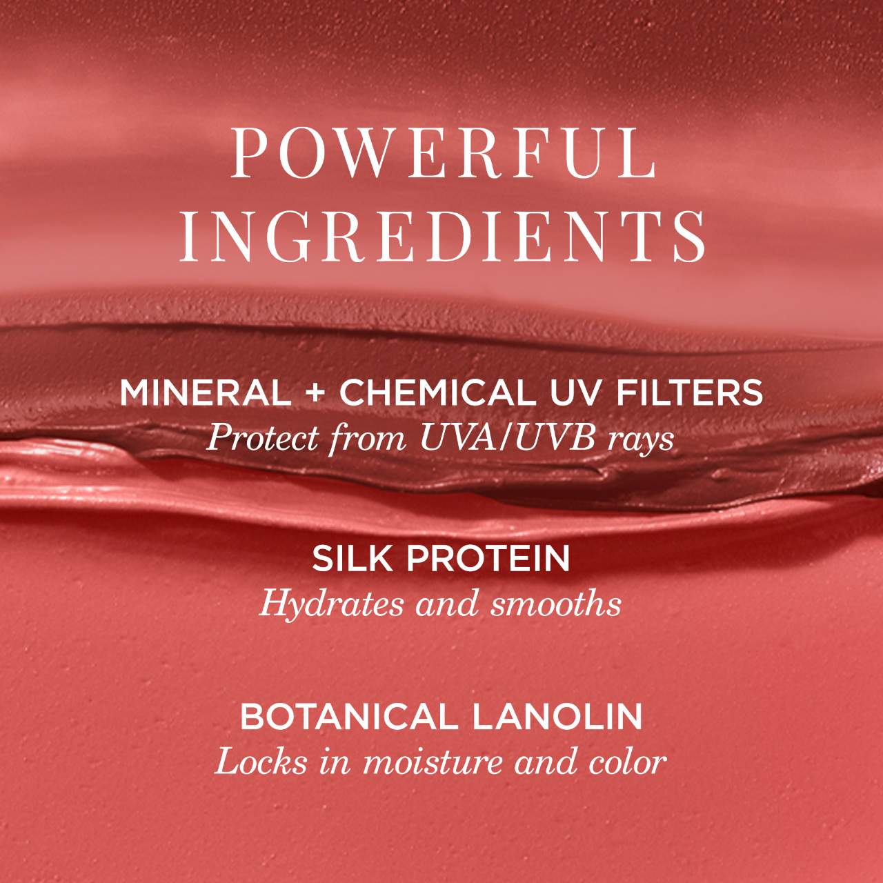 - Silk Protein: Mimics amino acid structure of skin to smooth, nourish, and hydrate lips.